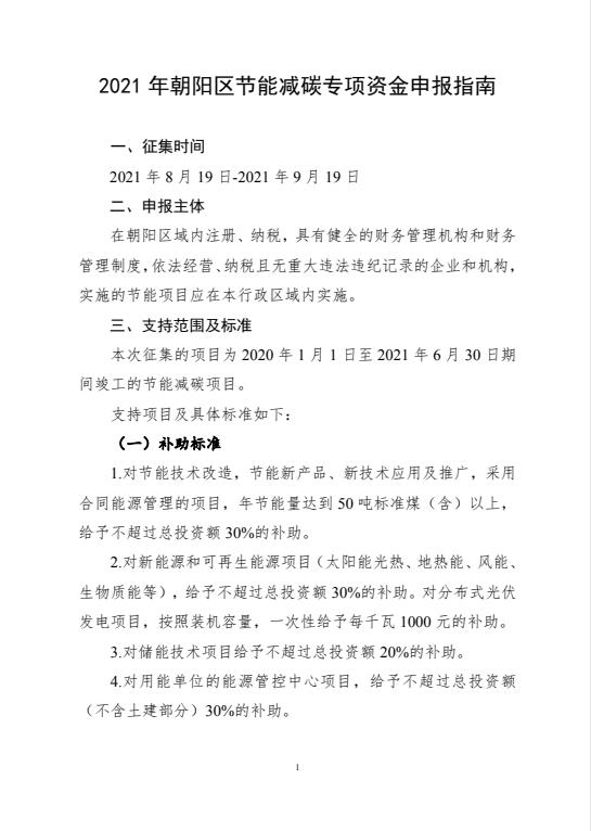 为做好节能减碳工作,落实好碳达峰碳中和各项任务,完成我区节能减碳目标,引导社会力量投入节能减碳工作,现组织开展朝阳区2021年节能减碳项目征集工作,具体通知如下: