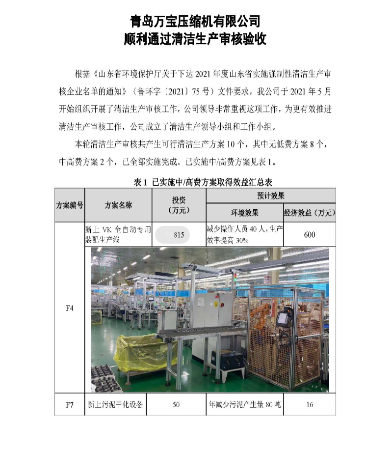 青岛万宝压缩机有限公司顺利通过清洁生产审核